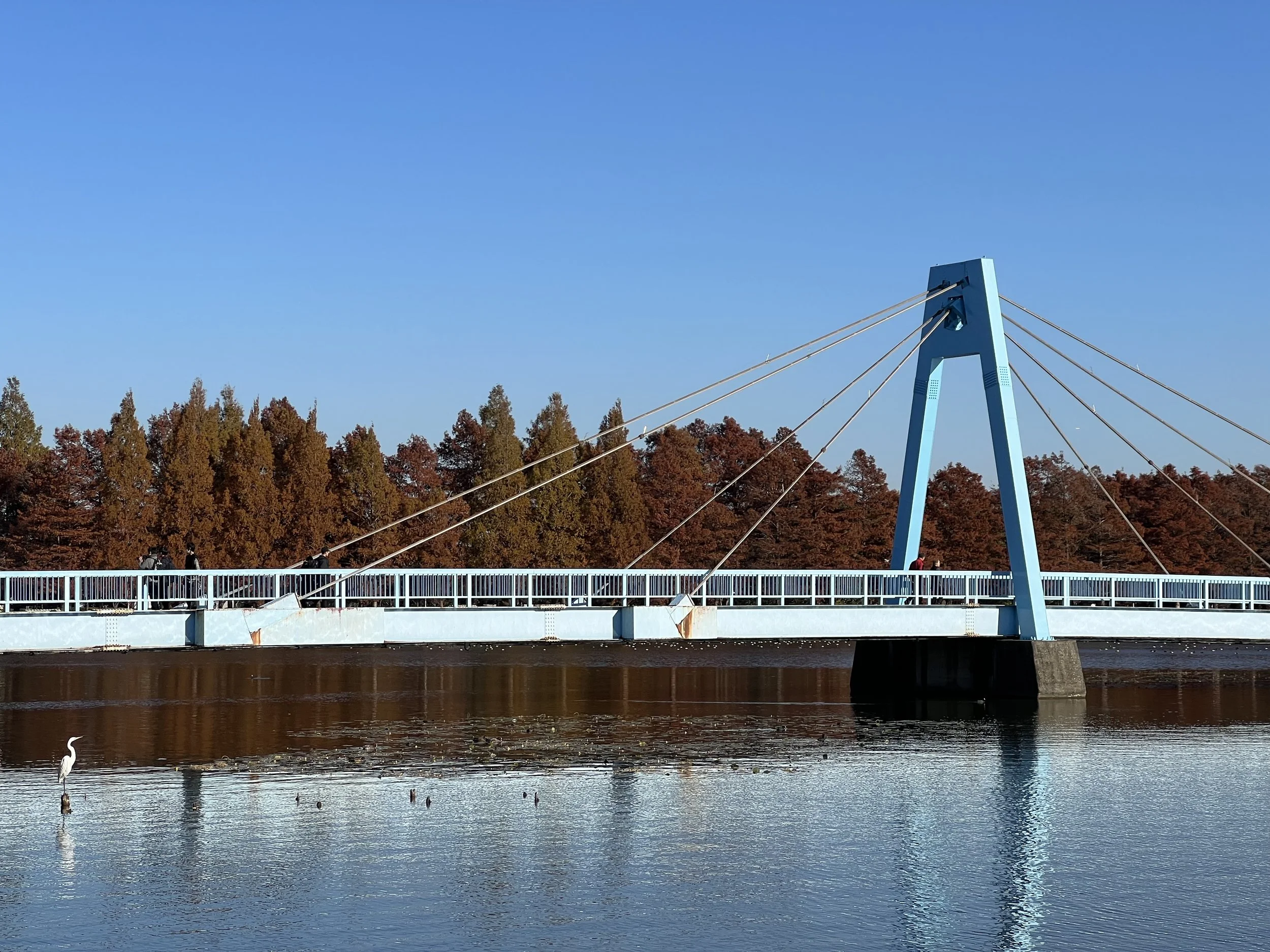 My first sight of Mizumoto Park was the iconic blue Mizumoto Bridge (水元大橋) set against a backdrop of vibrant autumn colors, the symbol of the park. Just north of the bridge, you’ll find the boat and bicycle rental shop, conveniently located next to the fountain square. After admiring the reflection of fall foliage on the opposite bank of the Edogawa River and watching birds peacefully resting on the still waters, I continued north along the tree-lined promenade beside the canal. This long walkway is especially breathtaking in autumn, offering uninterrupted views of the colorful leaves. The trees' reflections in the water create a stunningly picturesque scene, perfect for photography or a tranquil stroll.