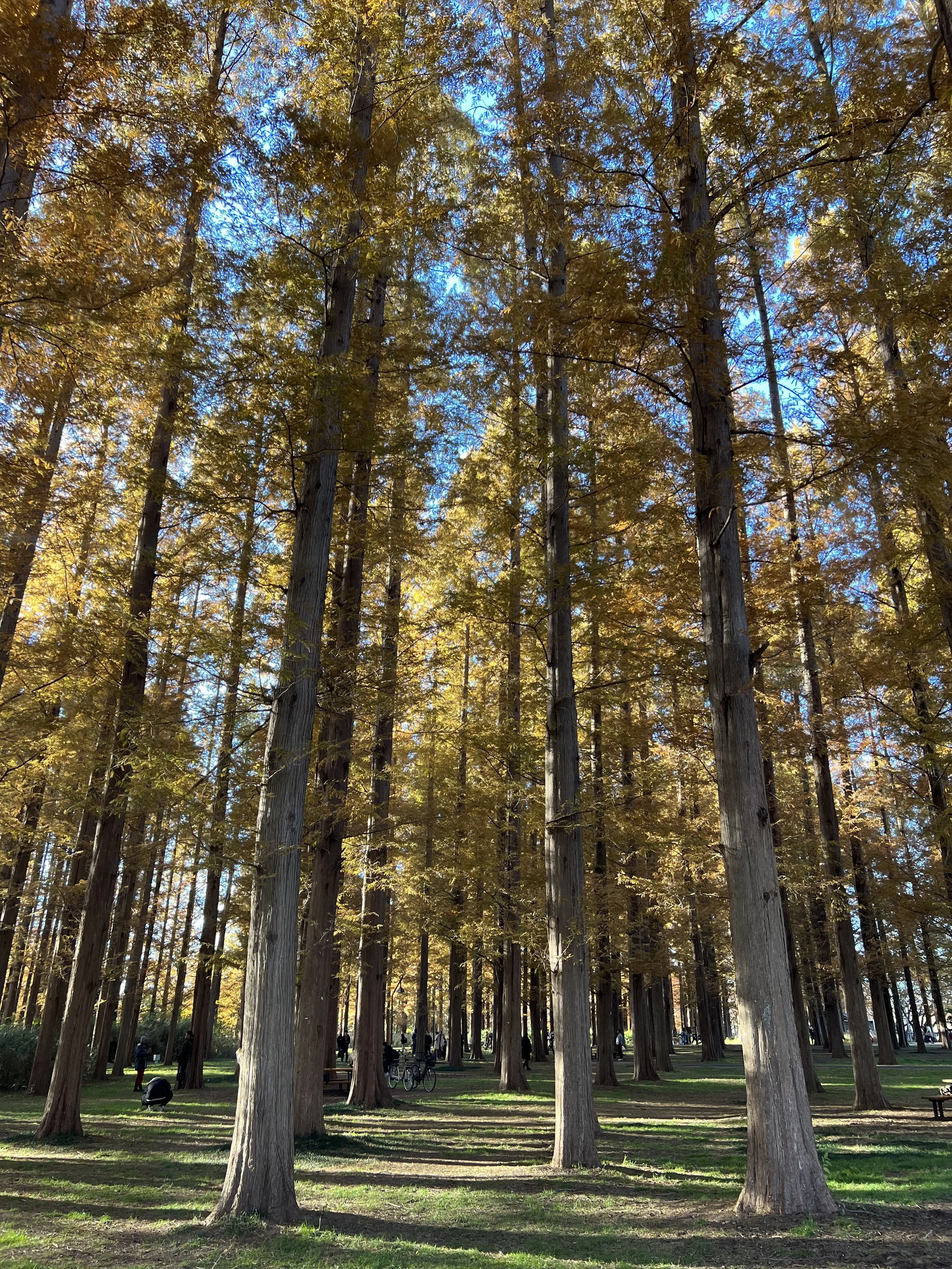 The highlight of the day was the walk through Mizumoto Park’s Metasequoia Forest (メタセコイアの森), a peaceful and majestic place, especially in autumn when sunlight filters through the towering trees. The tall rows of 1,500 Metasequoia trees, known as living fossils and about 20 meters tall, form a golden canopy as their needle-like leaves shift to vibrant shades of orange and brown.