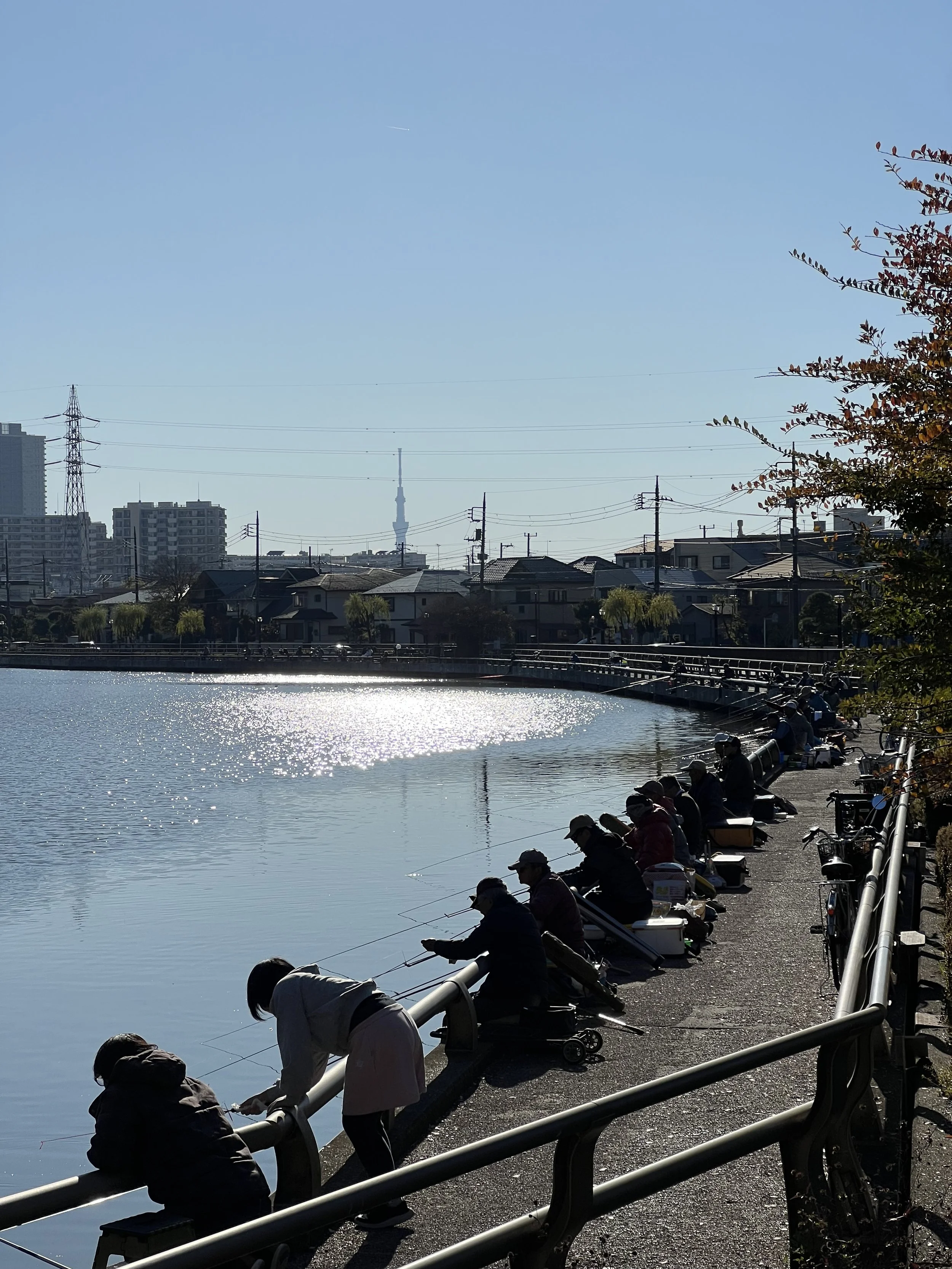 After our meal, on the way to Mizumoto Park, I took the opportunity to capture some of the urban scenery. Highlights included a large group of people fishing in the Mizumoto Inner Reservoir (水元小合溜), with a view of the Tokyo Skytree in the background, and streets adorned with a vibrant carpet of yellow gingko leaves, adding a touch of autumn magic to the area surrounding the park.