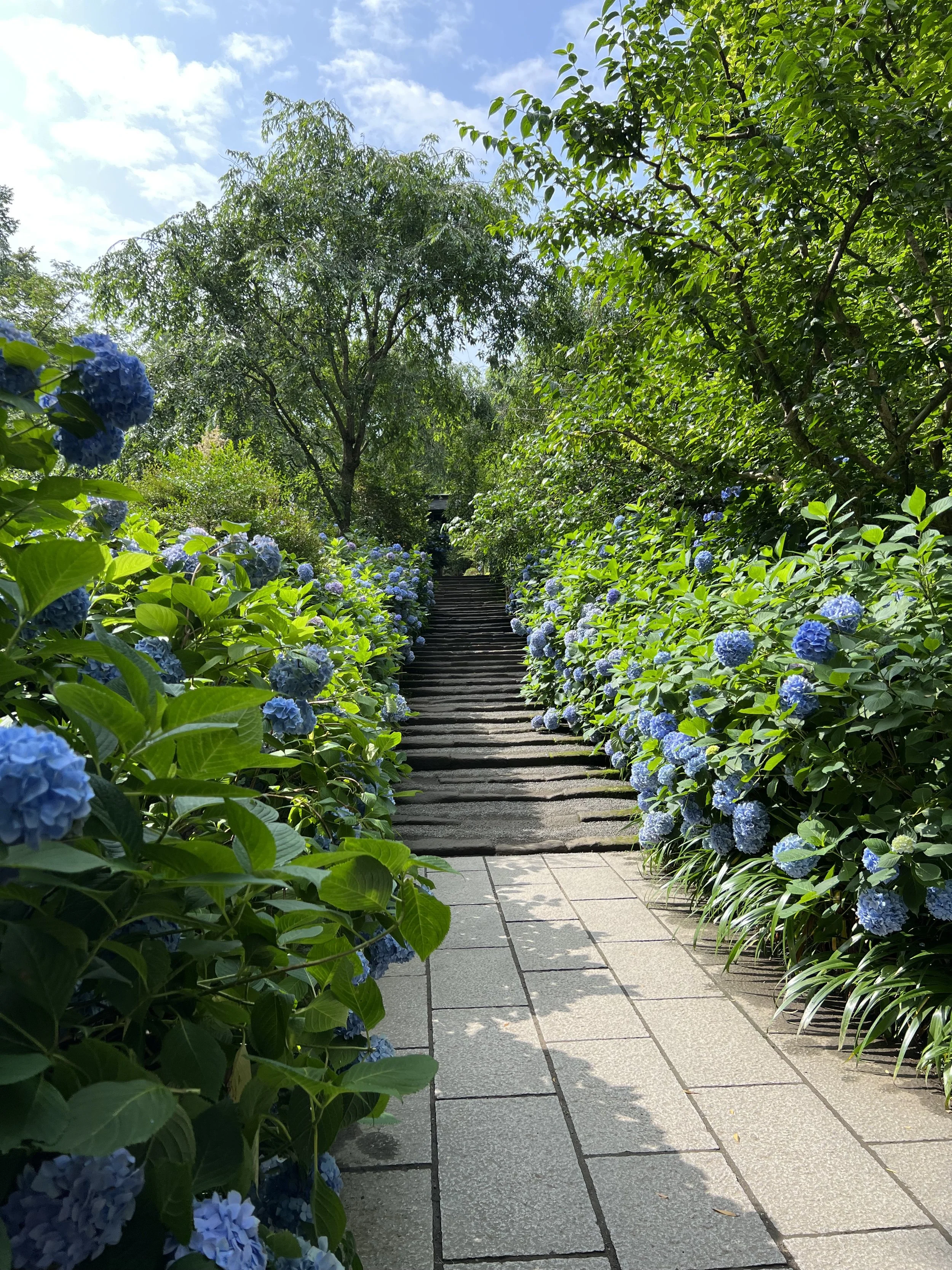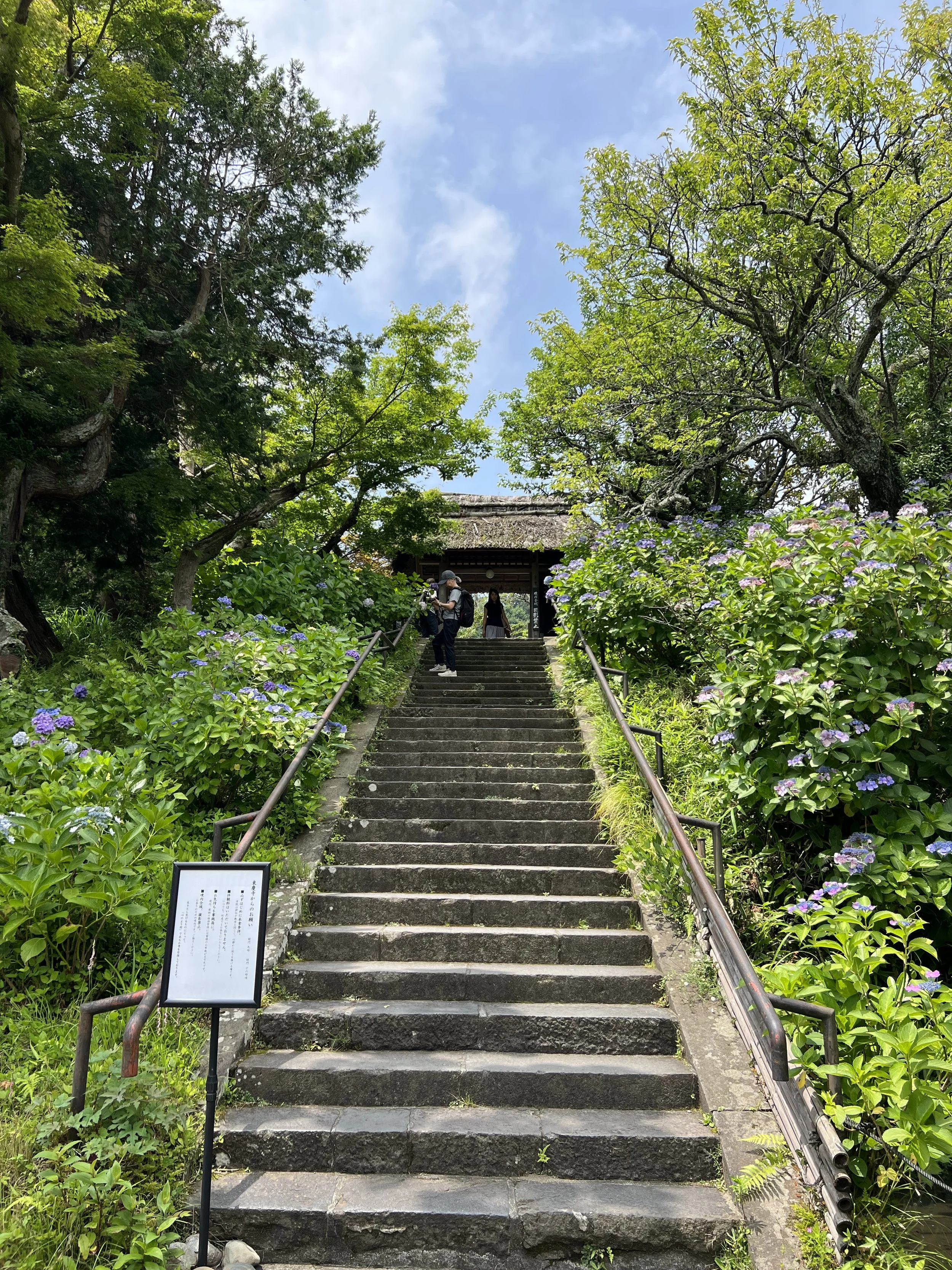 As I walked south towards the beginning of the hiking trail I was going to follow next, I saw a staircase on my right leading up to a temple, with hydrangeas on either side.